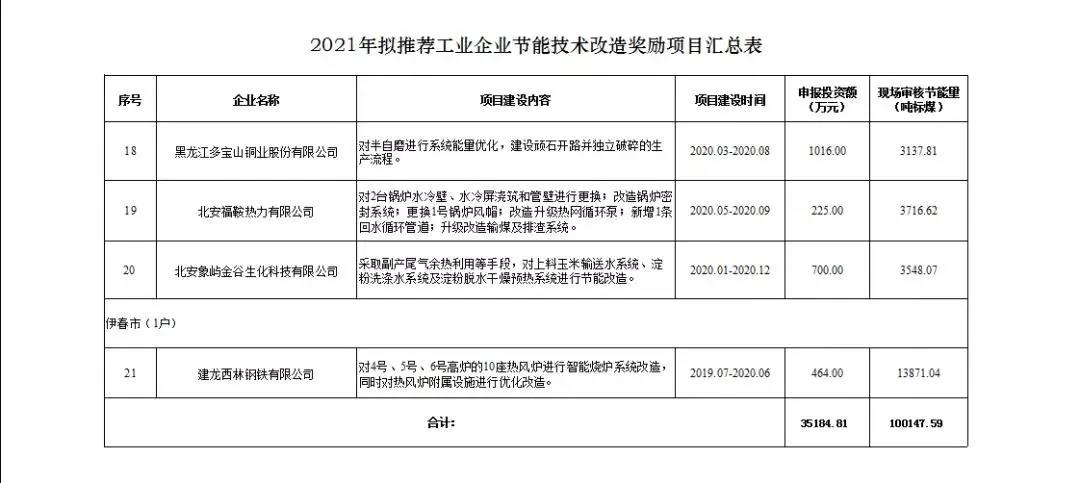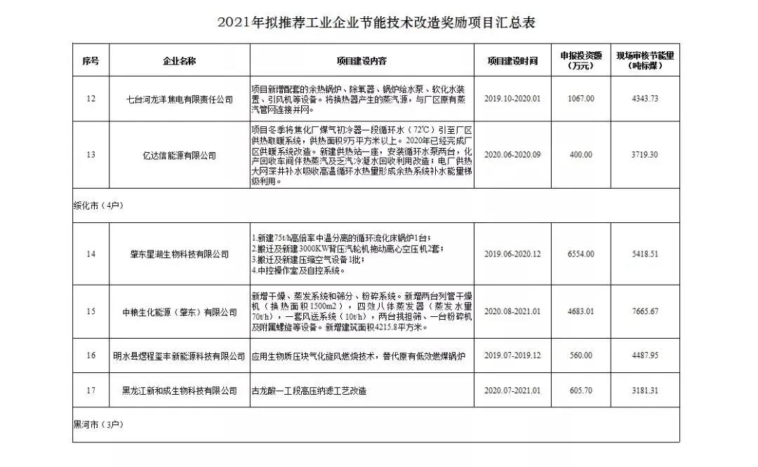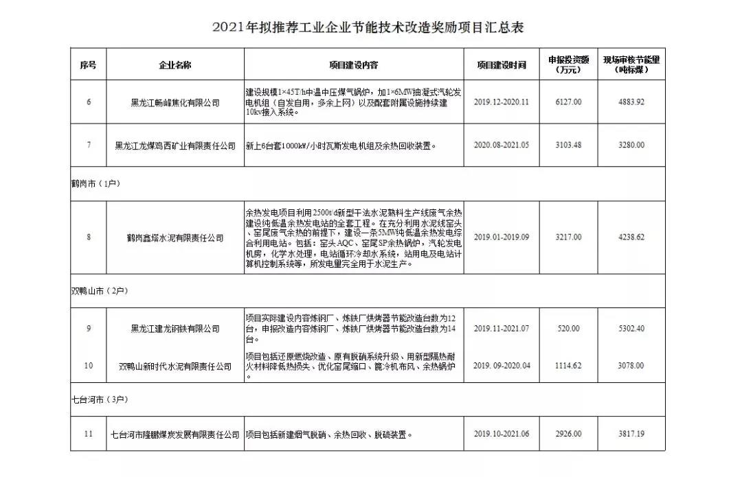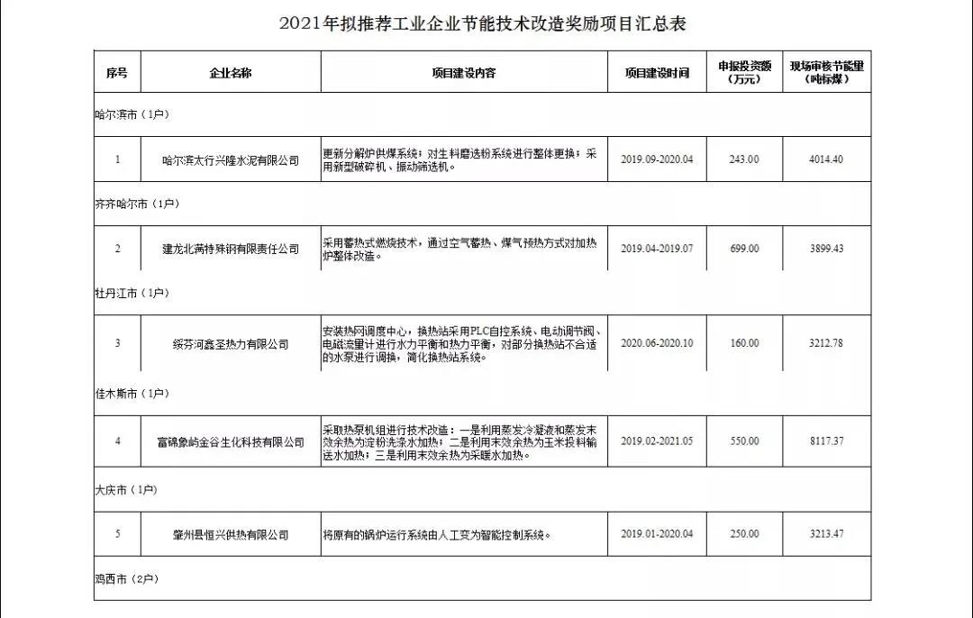 根據《黑龍江省工業和信息化委員會 黑龍江省財政廳關于印發〈黑龍江省工業企業節能技術改造項目獎勵資金審核工作實施細則〉的通知》(黑工信節規聯發〔2018〕4號)和《黑龍江省工業和信息化廳 黑龍江省財政廳關于組織申報2021年工業企業節能技術改造項目獎勵資金的通知》(黑工信節聯函〔2021〕611號)有關規定和要求,經企業申報、各市(地)工信主管部門和財政局推薦、省工信廳書面復查、第三方現場審核等程序,現將2021年擬推薦符合獎勵條件的工業企業節能技術改造項目向社會公示,請各界監督。如有異議,可在公示期內實名反映。