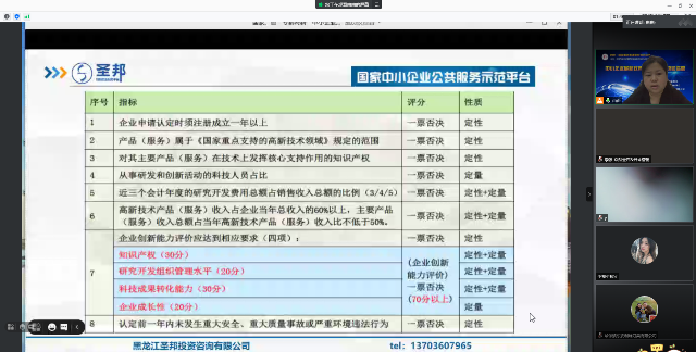 2021年3月11日,由黑龍江省科技創新協會、哈爾濱市科技服務業協會主辦,黑龍江圣邦投資咨詢有限公司承辦的2021·科技服務微課堂系列活動----國家高新技術企業申報及政策支持線上課堂正式上線。吳雪弘就國家高新技術企業申報及政策支持進行講解。圍繞《高新技術企業認定管理辦法》結合我省今年高新技術企業認定的政策條件對知識產權、科研人員、研發費用、高新收入占比、科技成果轉化、企業成長性等方面進行了解讀。重點強調了知識主權和研發費用的重要性和注意事項。