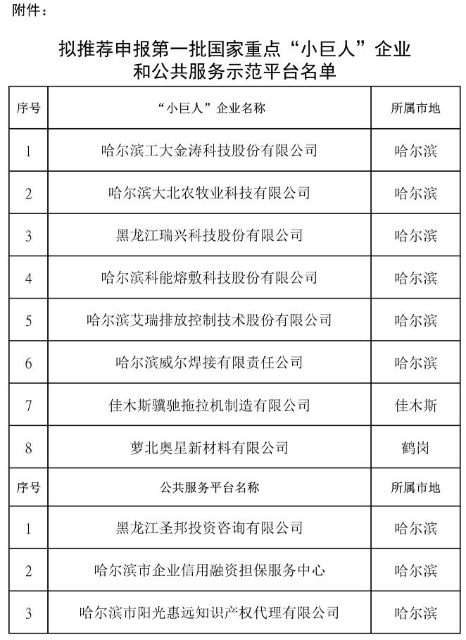按照《財政部 工業(yè)和信息化部關(guān)于支持“專精特新”中小企業(yè)高質(zhì)量發(fā)展的通知》(財建〔2021〕2號)要求,前期我廳會同省財政廳聯(lián)合下發(fā)《黑龍江省工業(yè)和信息化廳黑龍江省財政廳關(guān)于組織實施財政部工業(yè)和信息化部支持“專精特新”中小企業(yè)高質(zhì)量發(fā)展政策的通知》(黑工信企業(yè)聯(lián)發(fā)〔2021〕28號),并組織開展相關(guān)工作。經(jīng)市地把關(guān)推薦、組織專家評審等程序,擬推薦哈爾濱工大金濤科技股份有限公司等8戶專精特新“小巨人”企業(yè)申報國家第一批重點“小巨人”企業(yè),擬推薦黑龍江圣邦投資咨詢有限公司等3家中小企業(yè)公共服務(wù)平臺申報黑龍江省第一批支持國家(或省級)中小企業(yè)公共服務(wù)平臺。現(xiàn)將擬推薦名單予以公示。公示時間:2021年3月19日至3月29日(7個工作日)。歡迎社會各界進行監(jiān)督,如有異議,可在公示期內(nèi)實名反映。