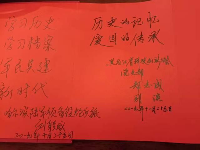 2019年11月25日下午2時30分,協會黨支部成員鄭志成、郭濱等同志到黑龍江省檔案館《黑龍江歷史記憶》展館參觀,館藏的檔案圖片展示了從清代以來黑龍江的歷史發展進程。《黑龍江歷史記憶》有:黑水文明,龍興故地,民國風云,苦難歲月,共和曙光,開啟新元,改革開放,繼往開來和70國慶等九大板塊。圖文并茂,內容豐富,臨近參觀結束,黨支部書記鄭志成在檔案館的題詞簿上題詞:歷史的記憶,愛國的傳承。